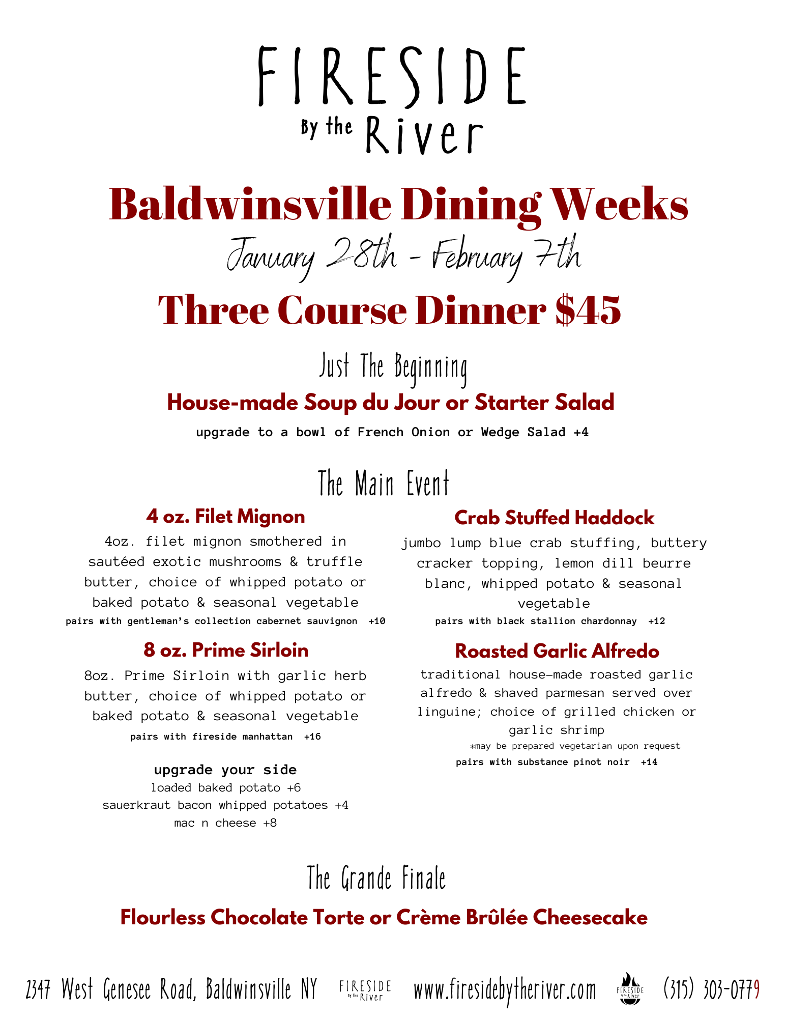 Baldwinsville Dining Weeks Three course dinner $45 • Jan 28 – Feb 7 Call for Reservations 315-303-0779 FireSide Valentines Day 2026